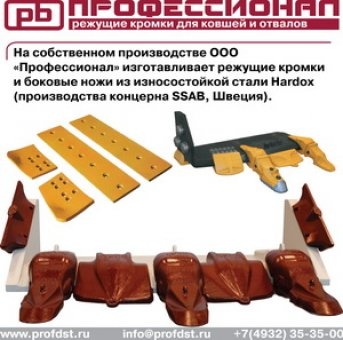 "Компания ""Профессионал"" - выполняет поставку режущих кромок для бульдозерных отвалов и экскаваторных ковшей, а также сменных бульдозерных, грейдерных ножей как собственного изготовления, так и ведущих европейских производителей. Оперативные сроки изготовления. Высокое качество. Износостойкая сталь .